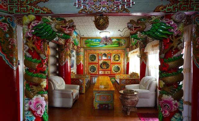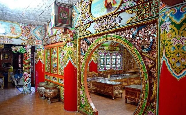 道孚民居室內(nèi)精雕細鏤,描金繪彩,每一個圖案或圖畫就是一個吉祥物或一個傳說。民居客廳陳設豪華,富麗堂皇,極顯主人的富有;經(jīng)堂供奉佛像,酥油燈長明,是家中的清靜之地;臥室多用箱式或椅式藏床,陳設溫馨而別具風情。