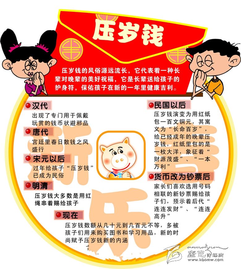 民間的習(xí)慣都是守歲守到半夜,即從除夕那天的亥時(shí)至元旦那天的子時(shí)之間開始入席,稱之為“分歲酒”。一家人歡歡喜喜地喝完分歲酒之后,長(zhǎng)輩還要給小孩子們分“壓歲錢”。舊時(shí)的風(fēng)俗,壓歲錢規(guī)定一百枚,用紅繩串好,取百年長(zhǎng)壽的意思。當(dāng)然,目前改為給給鈔票,數(shù)