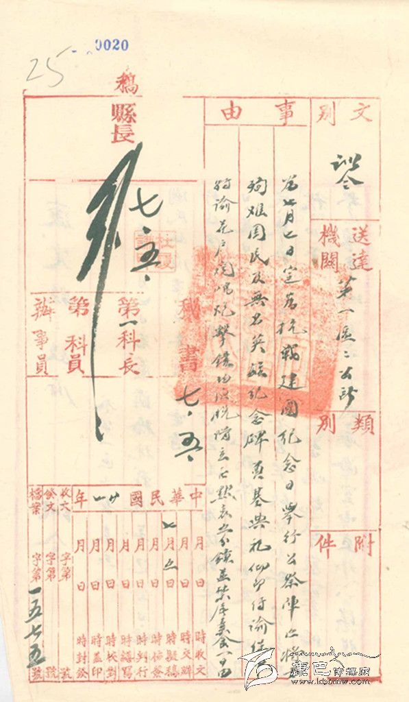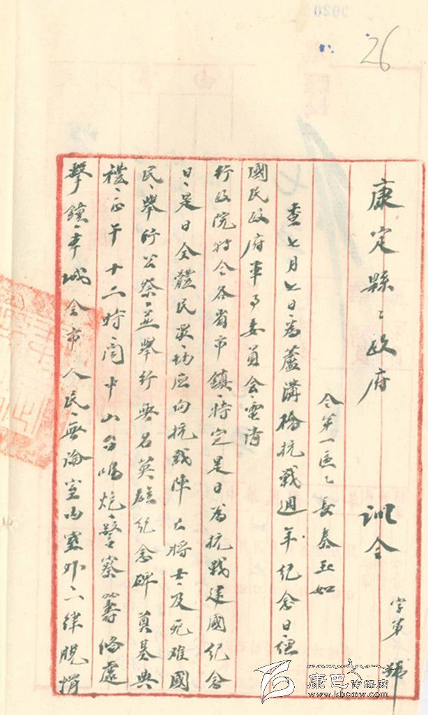 民國27年,即1838年7月5日,康定縣政府縣長杜履謙發(fā)出“訓令”,內容如下:“查7月7日為盧溝橋抗戰(zhàn)周年紀念日,經民國政府軍事委員會電請行政院特令各省市、鎮(zhèn):特定是日為抗戰(zhàn)建國紀念日。是日全體民眾均應向抗戰(zhàn)陣亡將士及死難國民舉行公祭,并舉行無名英雄紀念碑奠基典禮。正午12時,聞中山臺鳴炮,警察籌備處擊鐘,本城全市民,無論室內室外,一律脫帽立正默哀五分鐘。禁止屠宰,素食一日。此令”。