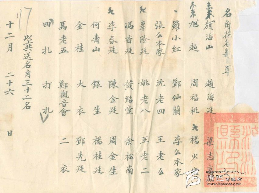不準(zhǔn)賭博做什么呢?當(dāng)時的當(dāng)權(quán)者還是費(fèi)了一番心思,他們從外地請來了一個川戲班子,為了吸引人們關(guān)注,康定縣政府把戲班的名角以及配角演員名單寫成海報(bào)張貼到街頭,又抄成傳單廣為散發(fā),用現(xiàn)在的話說是,做足了戲班出場前的前期宣傳工作。從名單上看,這是一個不小的戲班子,所謂名角竟有32名之多。想來對于沒有多少文化生活的康定民眾,還是有一定的吸引力。