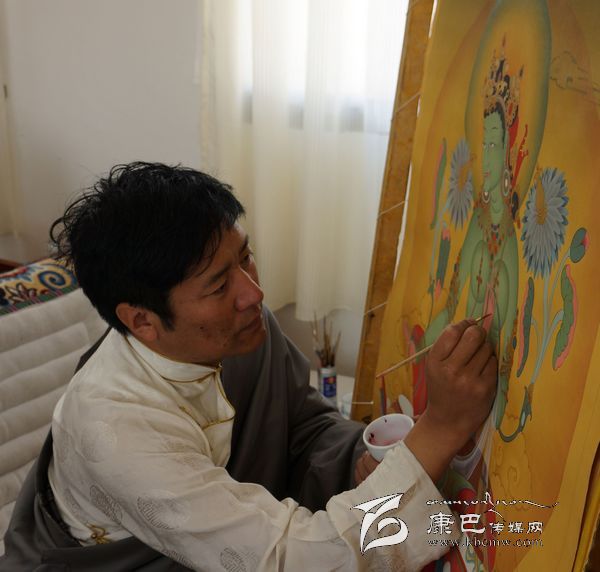 離開了傳統(tǒng)文化就如同失去了藝術(shù)創(chuàng)造的根基,脫離了公眾審美情趣也就意味著失去了未來發(fā)展的方向。他堅(jiān)持以“拉姆拉綽唐卡畫院”為基地,在廣泛汲取傳統(tǒng)文化“營(yíng)養(yǎng)”的基礎(chǔ)上,與其他畫師一道嘗試整合唐卡流派,發(fā)展噶瑪嘎止繪畫的材料技法,將世俗內(nèi)容納入唐卡創(chuàng)作的范圍之中,并在形式上大膽追求優(yōu)美高貴、色彩明亮、造型大方的藝術(shù)特色,試圖能夠?qū)ふ业揭环N新的創(chuàng)作出路。