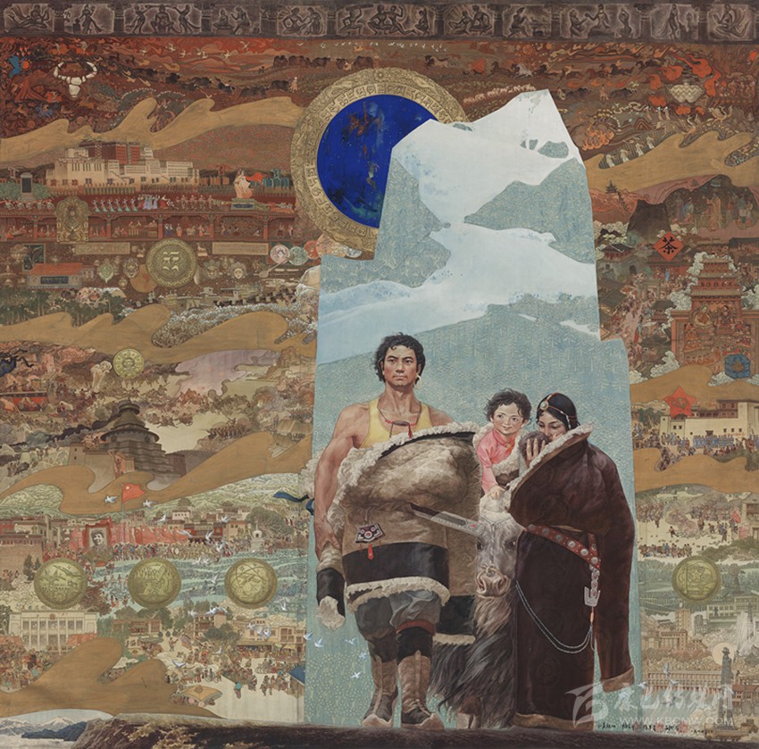 15世紀(jì)以來,唐卡發(fā)展所恒定的兩個元素:一是平面構(gòu)圖的神佛之境,另一則是吸收大青綠山水精髓。正如DNA鏈的雙螺旋結(jié)構(gòu)一般,使唐卡繪畫在歷史時空中穿插縈繞,在雪域各地生根開花。到了公元20世紀(jì)初,照片的高度寫實促使藏地畫家邁出了革新步伐,使得唐卡繪畫逐漸擺脫傳統(tǒng)束縛,開啟了“人”的覺醒。衛(wèi)藏地區(qū)出現(xiàn)了“根敦群培、安多強(qiáng)巴”引入寫實主義的嘗試,成為當(dāng)今西藏“布面重彩”的先驅(qū)。新中國成立后,內(nèi)地的美術(shù)創(chuàng)作積極影響了三大藏區(qū)的繪畫發(fā)展,上世紀(jì)80年代,四川康區(qū)“甘孜藏畫”肇起,在《嶺·格薩爾王》人文主義的召喚下,《雪山兒女》《唐東杰布》《新概念唐卡》正從歷史深處一路走來。而近年來,安多藏區(qū)則創(chuàng)新出了“藏族祥巴版畫”,祥巴版畫不僅是從材料技法上對西藏繪畫的豐富,更是藏地畫家們在自覺不自覺的求新、求變;甚至在傳統(tǒng)唐卡領(lǐng)域,民間畫師也都在紛紛嘗試將傳統(tǒng)唐卡和現(xiàn)代審美相結(jié)合。這一切,正是唐卡繪畫從傳統(tǒng)走向現(xiàn)代、由宗教博衍至生活的演變過程,在這個過程里,藏地畫家不僅在畫面的形式和語言上完成了傳統(tǒng)與當(dāng)代的統(tǒng)一,還將西藏的審美特質(zhì)虹化為作品的精神內(nèi)核。這也是唐卡藝術(shù)第二次“從香巴拉到人間”的過程,成為民族文化發(fā)展的新坐標(biāo)。