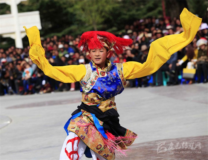 與藏族鍋莊不同,巴塘弦子在表演時,隊(duì)伍前面由數(shù)名男演員手持拉弦樂器“畢旺”,在隊(duì)伍前面一邊演奏一邊歌唱一邊領(lǐng)舞。其余的女舞者則跟在后面,舞動著長長的衣袖,邊歌邊舞,在行進(jìn)中跳成一個圓圈,然后不停旋轉(zhuǎn)。