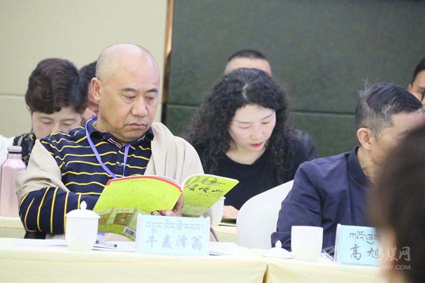 會議室正中的電子屏上,“貢嘎山期刊交流暨2019年藏漢文作家培訓會”白色字體赫然入目。室內(nèi)最靠后的桌上,《貢嘎山》200期紀念??ⅰ敦暩律健返?99期等藏漢文讀物有序擺放,吸引了不少“粉絲”當場品讀。