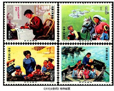 “燃燒自己,照亮別人”,是每一位教書人的精神寫照。在我國發(fā)行的郵票中就常常出現(xiàn)那些工作在基層的普通教師的忙碌身影。1959年9月25日,我國發(fā)行《人民公社》特種郵票,其中第5枚“學(xué)”,圖案是一位手執(zhí)課本神情專注地在課堂上教學(xué)的老師。這是我國郵票中首次出現(xiàn)教師形象。1966年5月10日,我國發(fā)行《服務(wù)行業(yè)中的婦女》特種郵票,其中第4枚“保育員”,是反映我國幼兒教師工作情景的一枚郵票。1976年2月20日,我國發(fā)行《勝利完成第四個(gè)五年計(jì)劃》紀(jì)念郵票,其中第13枚“牧區(qū)小學(xué)”,圖案是一位藏族女教師在寬敞明亮的教室里授課的情景,反映了新中國成立后,特別是第四個(gè)五年計(jì)劃期間,我國少數(shù)民族地區(qū)飛速發(fā)展的教育事業(yè)。1975年3月8日,我國發(fā)行《鄉(xiāng)村女教師》特種郵票,全套4枚,圖案分別是“認(rèn)真看書學(xué)習(xí)”“巡回教學(xué)”“開門辦學(xué)”和“水上小學(xué)”。全套郵票是工作在廣大農(nóng)村的中小學(xué)教育工作者在辦學(xué)條件艱苦的情況下仍然堅(jiān)持認(rèn)真學(xué)習(xí)、勤奮工作、忠于黨的教育事業(yè)的真實(shí)寫照。