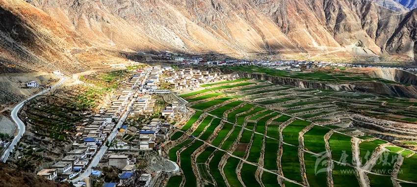 從得榮縣城出發(fā),途經(jīng)日龍鄉(xiāng),汽車(chē)順著盤(pán)山公路開(kāi)始往下行駛,到半山腰處,司機(jī)輕輕踩一腳剎車(chē)熄火,在此作短暫休息。這時(shí),我打開(kāi)車(chē)門(mén)俯瞰金沙江畔的因都?jí)危?jiàn)公路兩側(cè)一排排整齊的房屋像火柴盒一樣連綴在平坦壩子上,房屋下端,麥田梯次舒展,麥浪涌動(dòng),蔚為壯觀。