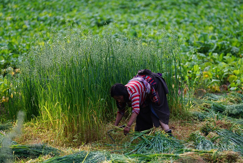 開始收割了,從坡地到川地,到處是收割機(jī)的聲音。青稞是車巴溝的主要作物,因?yàn)橐デ囡?,要吃糌粑。村里人忙得團(tuán)團(tuán)轉(zhuǎn),收割機(jī)開過去,大家就跟在后面撿穗子。如此往復(fù),一直要到糧食拉到家里。