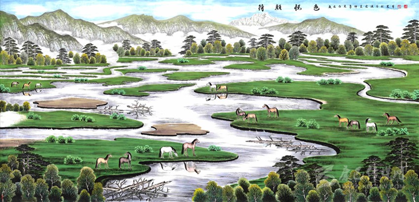 裴洪波告訴記者,經(jīng)實(shí)地取景后,麥崩特色結(jié)合大渡河舊稱,《沐水歡歌》一畫應(yīng)運(yùn)而生。該幅畫作的“新”主要表現(xiàn)在兩方面,一是新時(shí)代下魚通人的新生活。二是畫作色彩運(yùn)用上的新穎。其中,新生活方面,隨著脫貧攻堅(jiān)、鄉(xiāng)村振興的推進(jìn),麥崩村民們過(guò)上了幸福生活。色彩新穎方面,區(qū)別于其余“康定新八景”,《沐水歡歌》更多地采用了中國(guó)畫的青綠山水畫法。