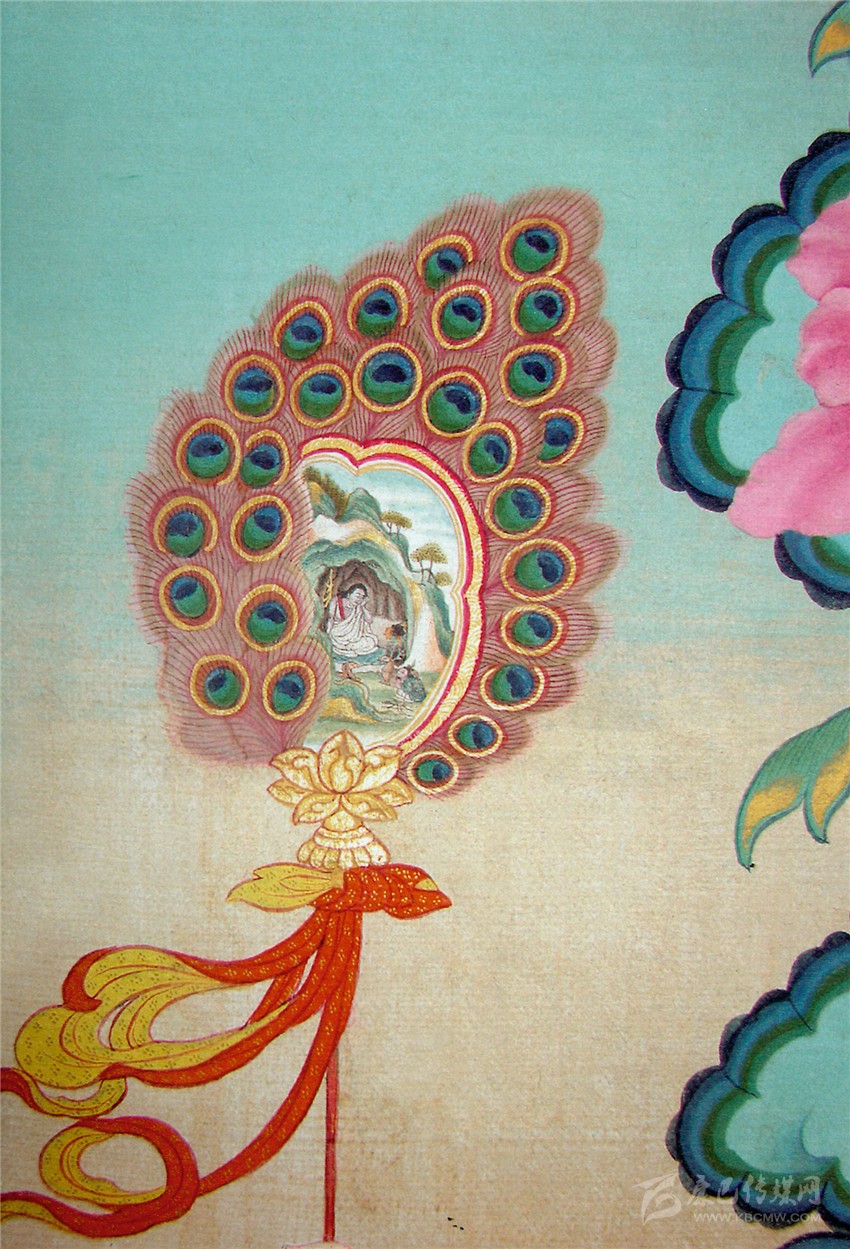 當然,我們可以從存世的作品上印證他的這種能力。比如是在《如意寶藤之釋迦牟尼》中:左側(cè)侍女手持一把孔雀羽扇,在羽扇的中央是一塊約四平方厘米的畫屏;在這個小小的空間里面,郎卡杰描繪了一幅微縮的《修行圖》,圖中米拉日巴正在洞中苦修,洞口蹲伏著獵犬、鹿和獵人。畫中動物與人結(jié)構(gòu)準確,五官準確,須發(fā)清晰,衣紋細密流暢;山洞上的樹木能區(qū)分出樹干和樹葉;天空的白云有遠近層次。在這不足盈寸的空間里,用毛筆刻畫這般細致,令人嘆為觀止。