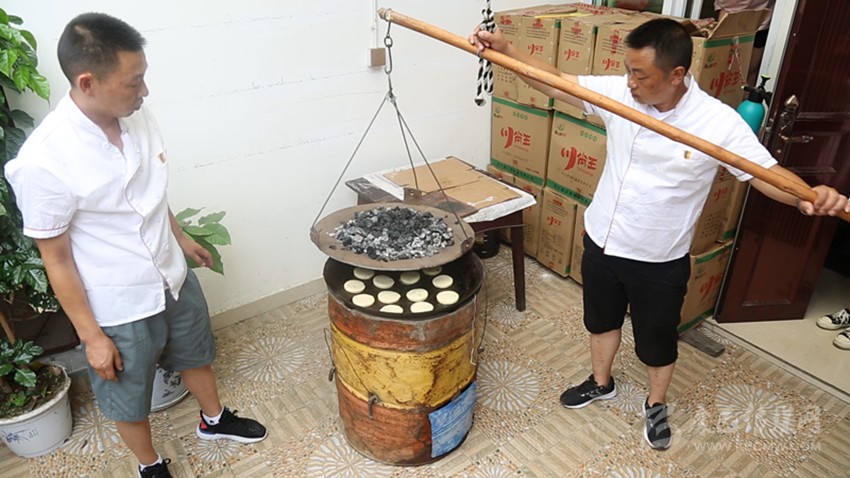 用酥皮包裹好餡料,放入模具內(nèi)壓緊壓實。點心脫模后在點上屬于“周聾子點心”的獨家標(biāo)記(四瓣花),便可進(jìn)入烤制流程,烤爐分為上鏊與下鏊。首先將吊爐上下火都提前預(yù)熱至250°左右,然后把制作好的點心正面朝下放在吊爐里,最后將上鏊移入吊爐上方,進(jìn)行點心的烤制。根據(jù)經(jīng)驗確定烤制時間,當(dāng)?shù)鯛t里飄出香味后,即可將上鏊挪離吊爐。點心背面呈現(xiàn)出“偷油婆色”(焦黃色)后,迅速將點心翻面,繼續(xù)烤制成褐色,出爐即可食用。