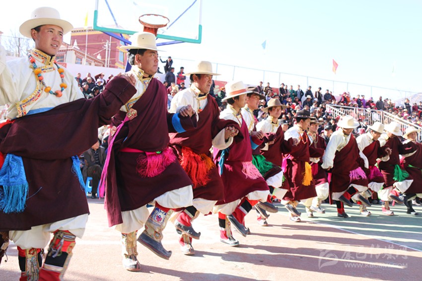 弦子比賽開始了。精神矍鑠,頭戴紅須“嗦啊”的扎西第一個(gè)出場(chǎng)。白色“仙子”(藏式襯衫)的長(zhǎng)袖一層層疊到手腕,藍(lán)緞子藏式背心在陽(yáng)光的映襯下,顯得格外光亮耀眼。一把彩色弦胡抵在左腰,左手幾個(gè)指姆在馬尾琴弦上靈動(dòng)地起落按擦,右手輕松自如地拉動(dòng)琴弓,琴弦伸縮間,琴筒里發(fā)出悠揚(yáng)的弦子聲。他扯開嗓子起音,聲音宏亮,身后十一個(gè)胡琴手齊拉共唱,后面一百多位著盛裝的男女舞者動(dòng)作整齊劃一,一個(gè)回環(huán)往復(fù)的圓圈逐漸形成,原生態(tài)歌聲化漾開去,從廣場(chǎng)的四面八方升騰起來(lái),在天際飄蕩:
